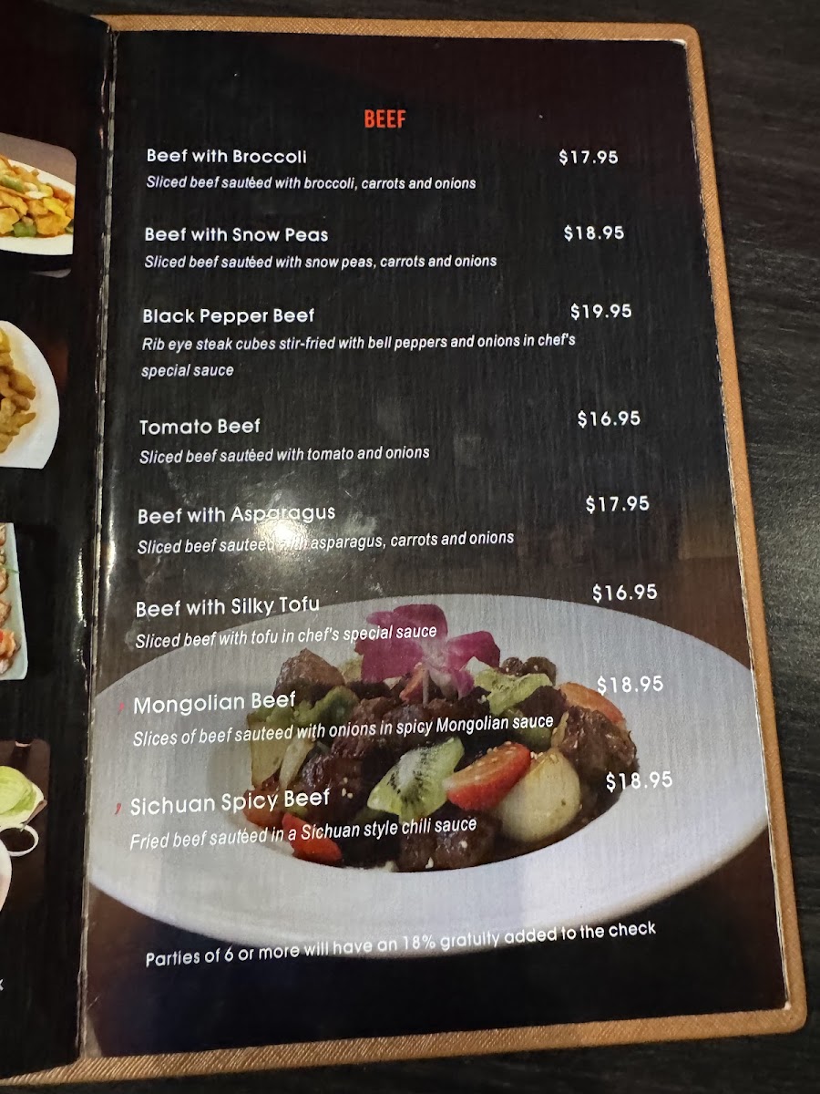 The menu offers a wide variety of Asian cuisine options, structured into clear categories to suit different dining preferences. Appetizers include selections such as honey barbecued spare ribs, salt & pepper calamari, assorted fried items like prawns, cream cheese rangoons, and egg rolls. The beef section features dishes like black pepper beef, Mongolian beef, and beef prepared with snow peas or tofu, highlighting a range of stir-fried preparations.
