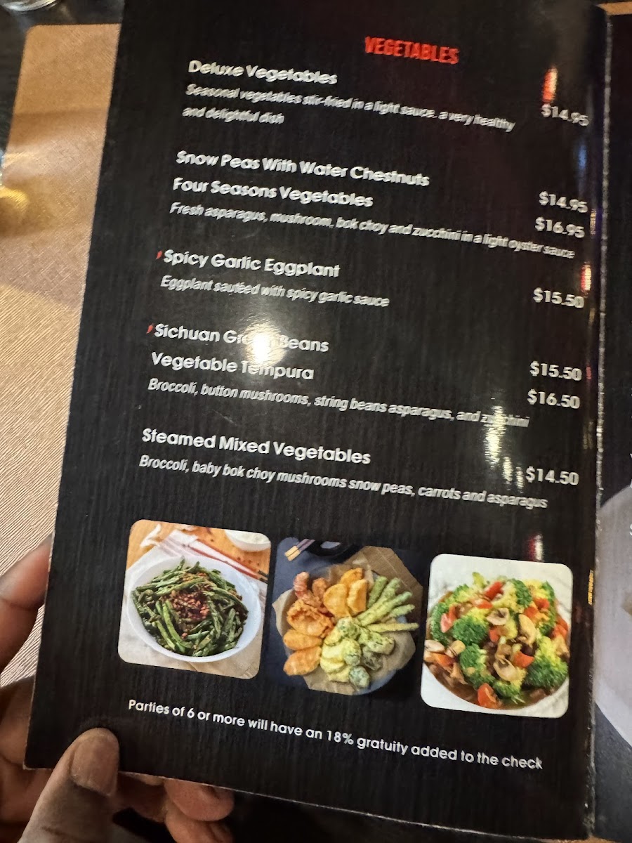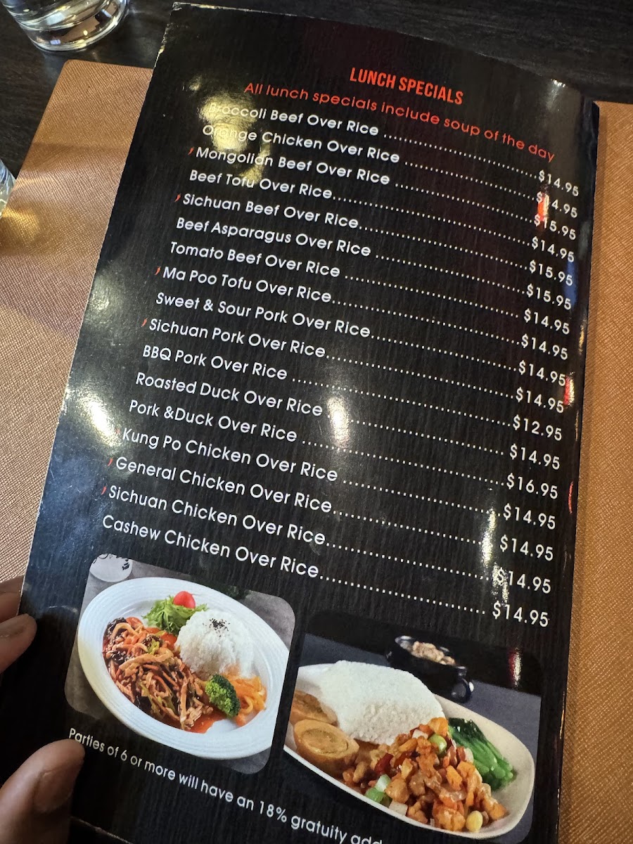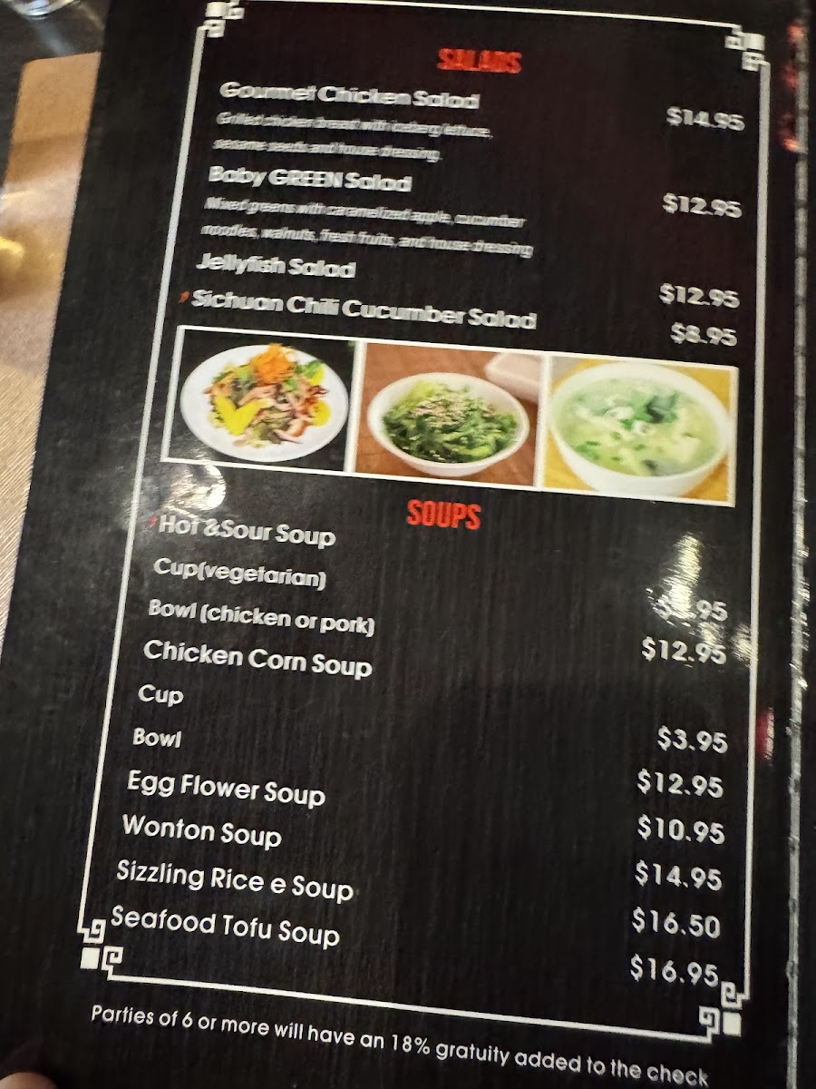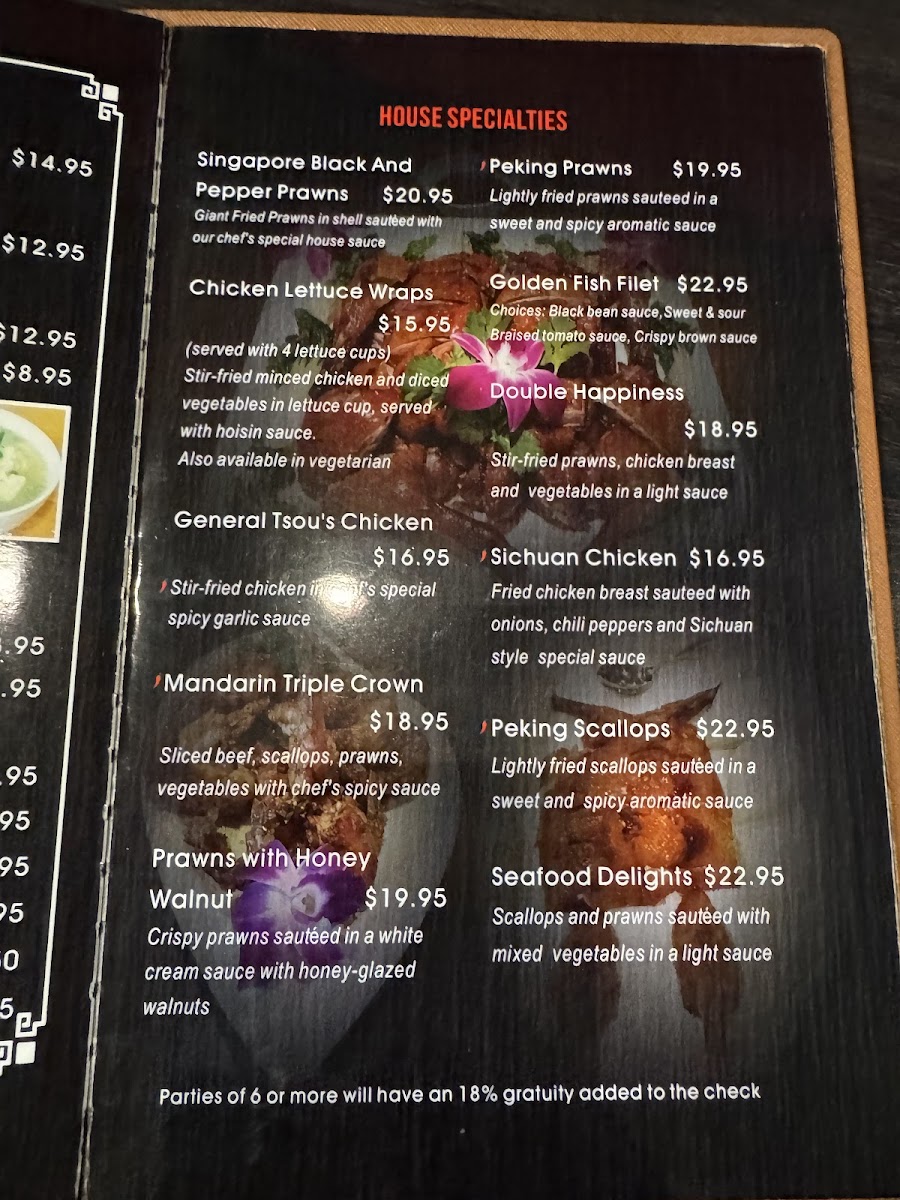 The menu also contains soups and dim sum items, along with beverages such as Thai tea and sake bombs, offering both non-alcoholic and alcoholic choices. Seafood is represented with dishes like prawns with walnuts, seafood combos, and salt & pepper calamari.